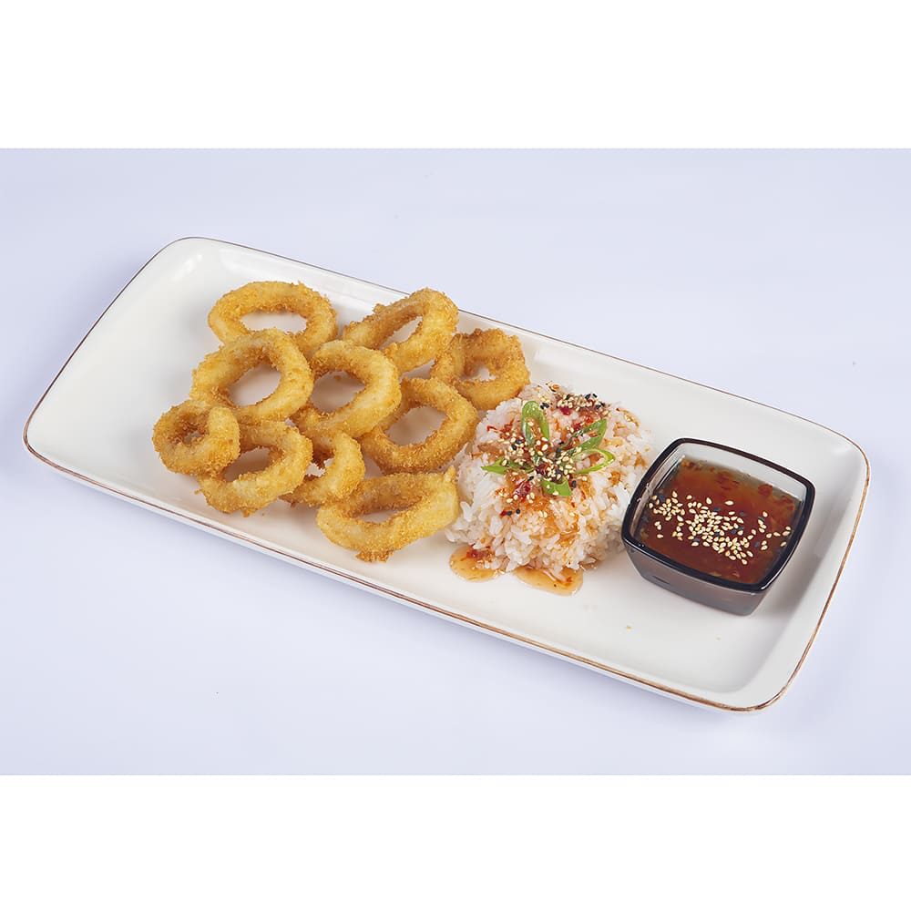 Squid, Oil, Rice, Sweet and Sour Sauce, Panko.